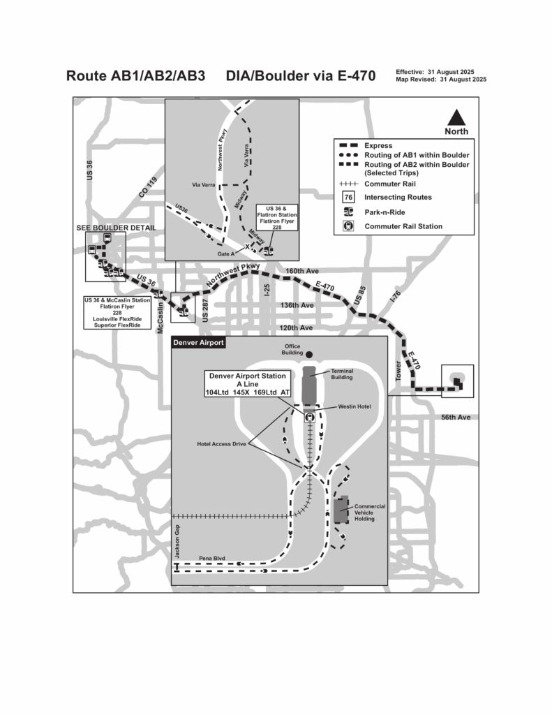 SkyRide Routes AB1 and AB2, ‘Boulder / Denver Airport’, run from to Downtown Boulder Station and Boulder Junction to Denver Airport via US 36, Flatiron, the Northwest Parkway and E-470.